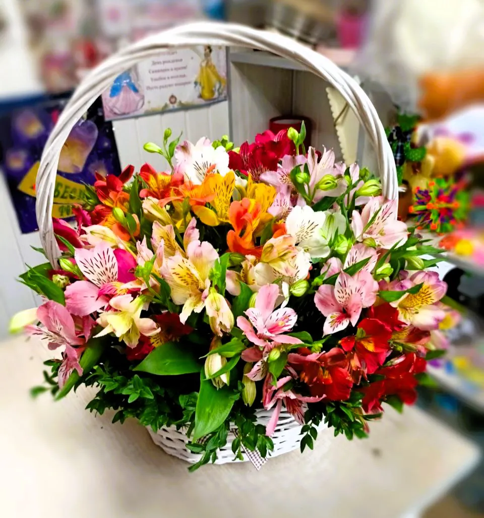Корзина с альстромериями — это идеальный подарок для любого случая. Эти изысканные цветы, известные своей яркой палитрой и богатой символикой, привносят в любое пространство атмосферу радости и уюта. Альстромерии олицетворяют дружбу и преданность, что делает их прекрасным выбором для поздравлений, выражения чувств или просто для украшения вашего дома. Корзина с альстромериями станет стильным акцентом в интерьере и прекрасным дополнением к праздничному столу. Натуральная зелень и яркие цветы создадут гармонию и радость, поднимая настроение вам и вашим близким.