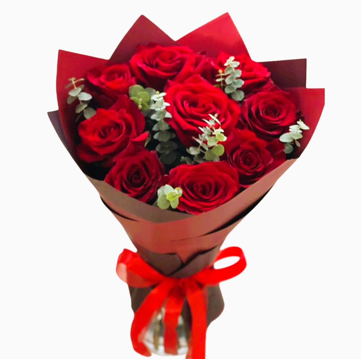 Букет из красных роз с зеленью -  изысканная композиция, покоряющая своей элегантностью!