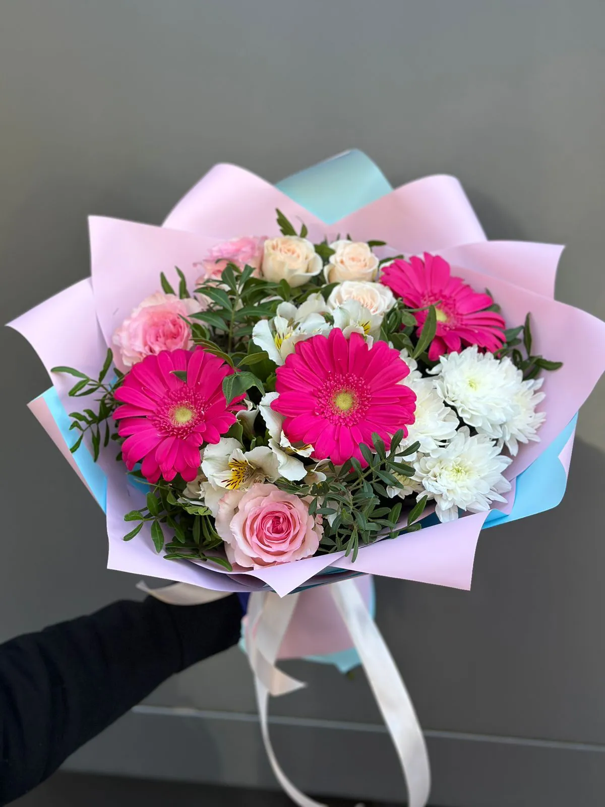 Этот изысканный букет, состоящий из розовых гербер, белой альстромерии, белой хризантемы и розовых роз, является настоящим произведением искусства. Яркие розовые герберы, словно солнечные лучи, привлекают внимание своей живостью и радостью, символизируя оптимизм и жизнерадостность. Белая альстромерия, с её нежными лепестками, добавляет букету лёгкость и изящество, олицетворяя чистоту и искренность чувств.