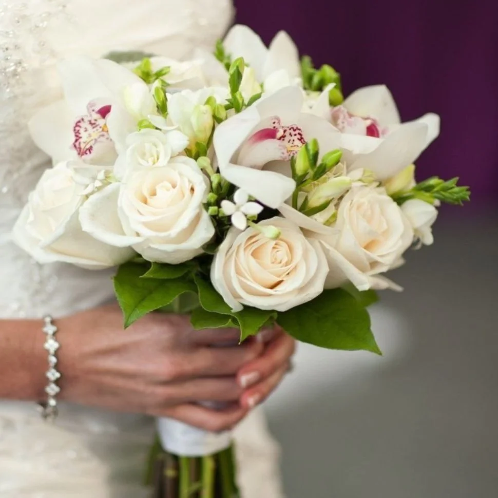 Букет невесты из роз, орхидей и фрезий.
