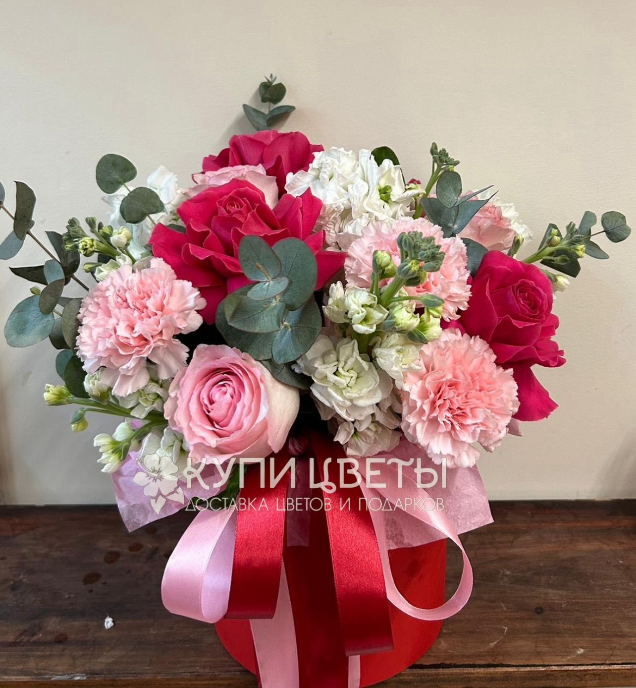 Французкая роза, роза, гвоздика, эвкалипт, шляпная коробка, лента