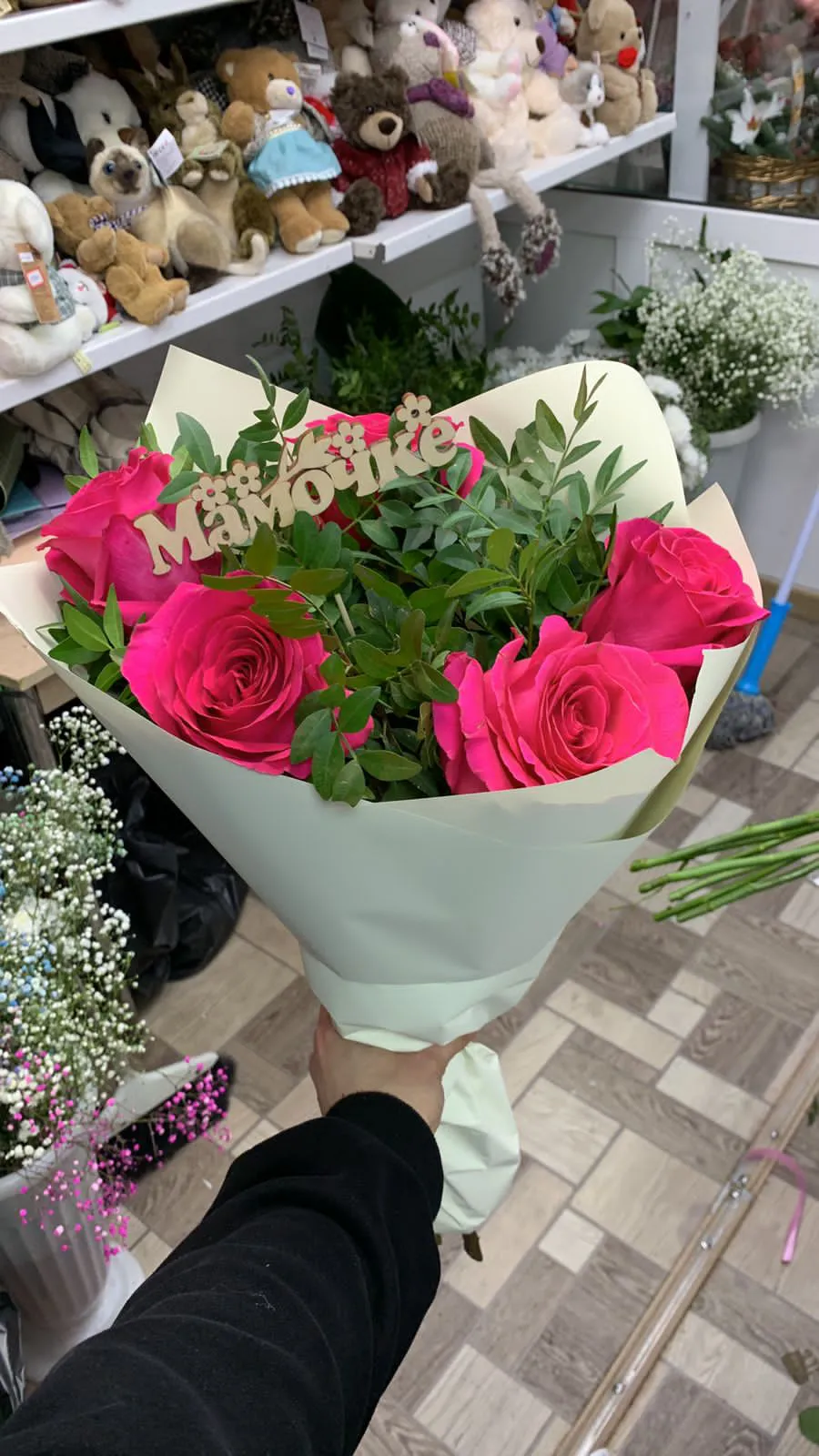 - Средний - роза - 9 шт., зелень, топпер, упаковка, лента