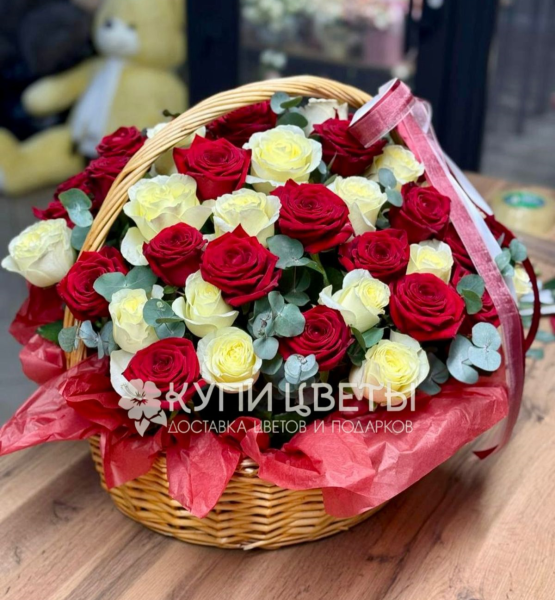 Независимо от повода, такая корзина всегда станет центром внимания и вызовет искреннюю улыбку на лицах близких. Подарите радость и впечатления с помощью этого красивого букета из красных и белых роз, и пусть каждый цветок станет символом ваших чувств!