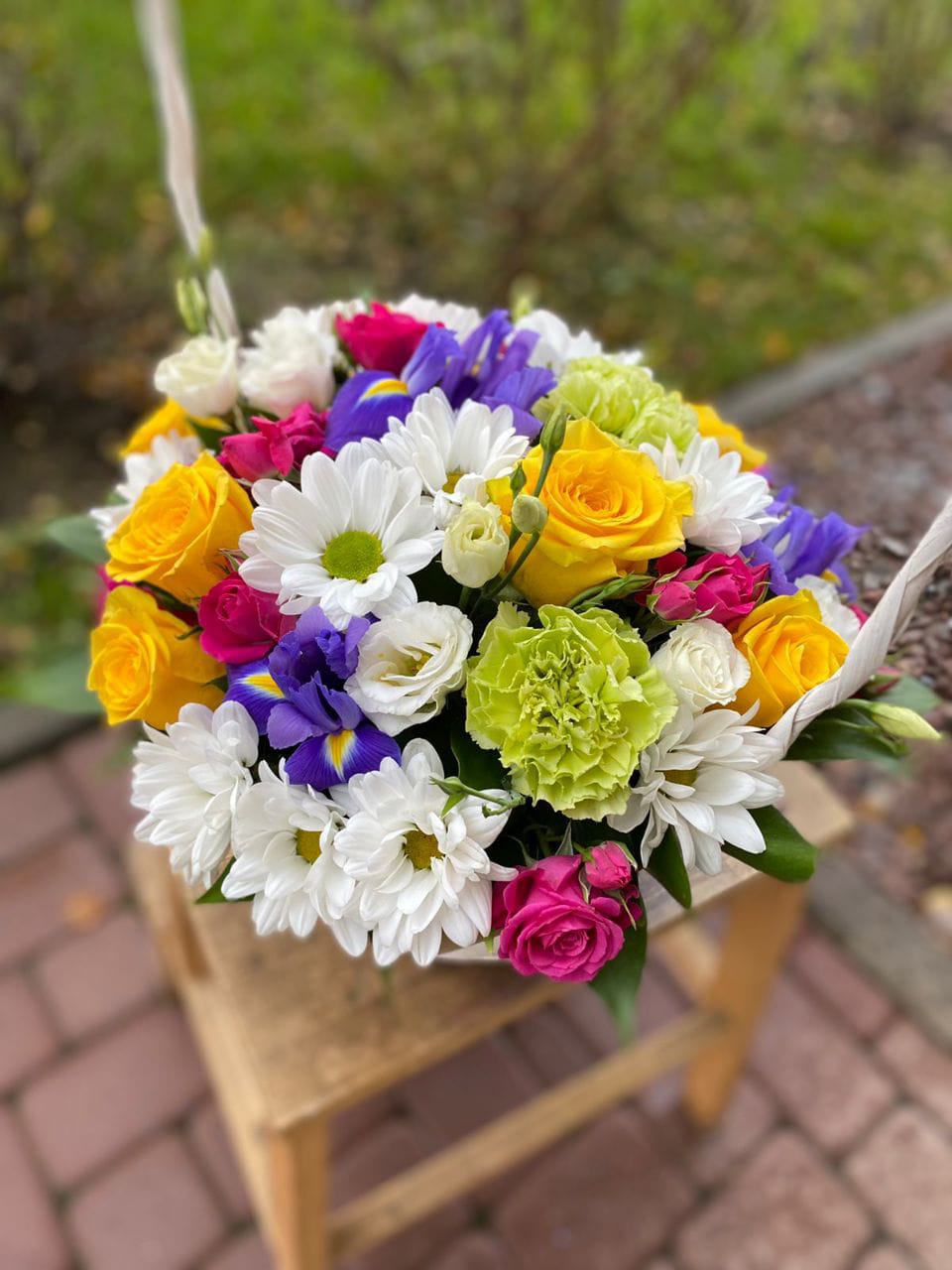 Вариант—Стандарт - роза - 7 шт., эустома - 3 шт., хризантема - 3 шт., ирис - 3 шт., гвоздика - 3 шт., салал, оазис, корзина