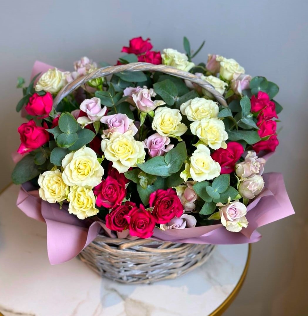 Кустовые розы в корзине — это истинное воплощение нежности и утончённой красоты. Каждая роза, словно маленькое сердце, распускается в ярких и пастельных оттенках, от молочно-белого до насыщенного бордового, создавая гармоничное сочетание цветов. Их бархатные лепестки сладковато пахнут и притягивают взгляд, мгновенно наполняя атмосферу теплотой и радостью.