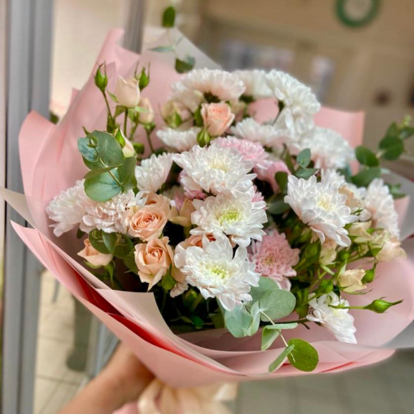 Вариант—Стандарт - кустовая роза - 2 шт., хризантема кустовая - 3 шт., упаковка, лента