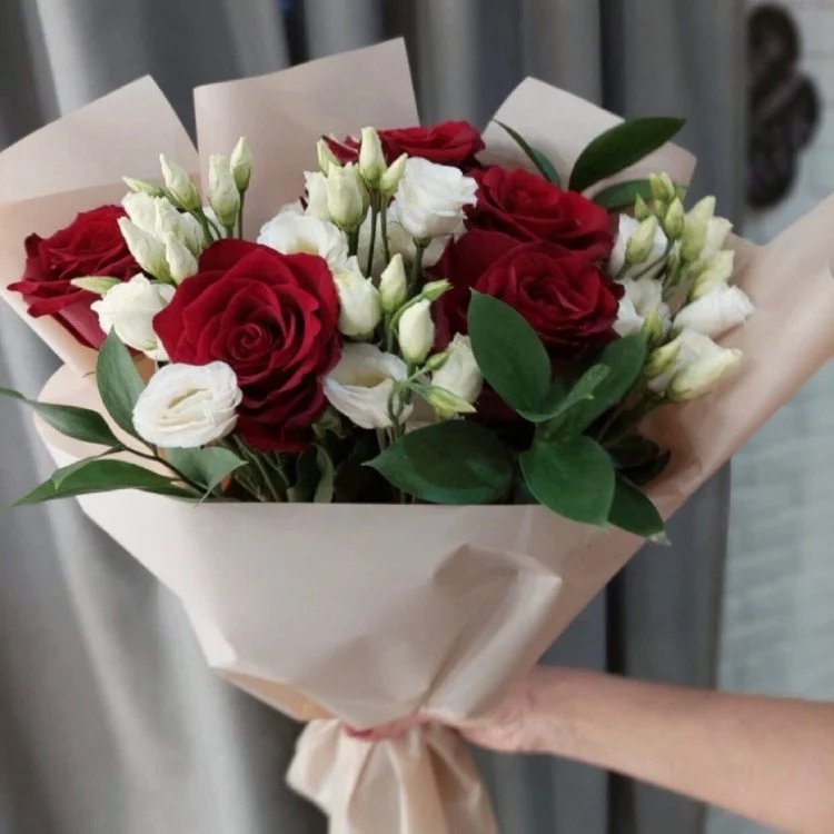 Состав букета: розы, лизиантусы, зелень, упаковка, лента.