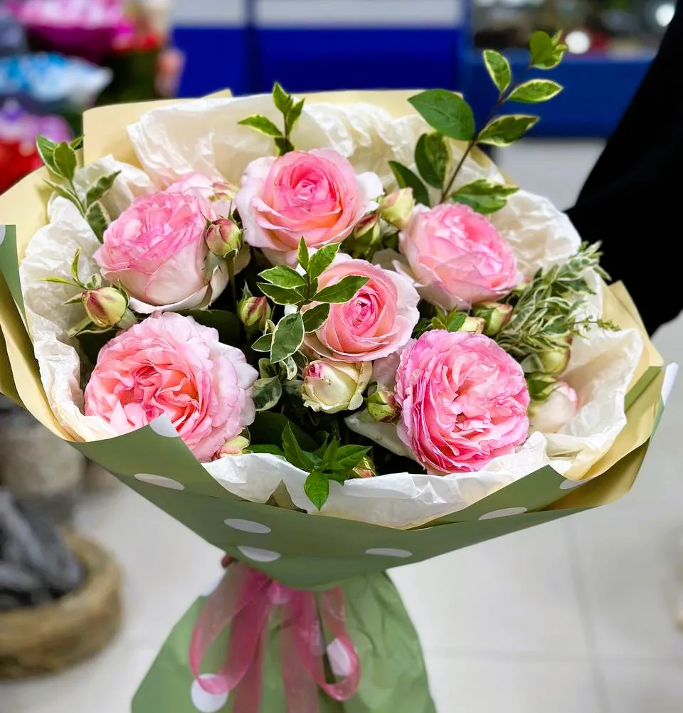 пионовидные одноголовые розы, зелень, упаковка,лента |
