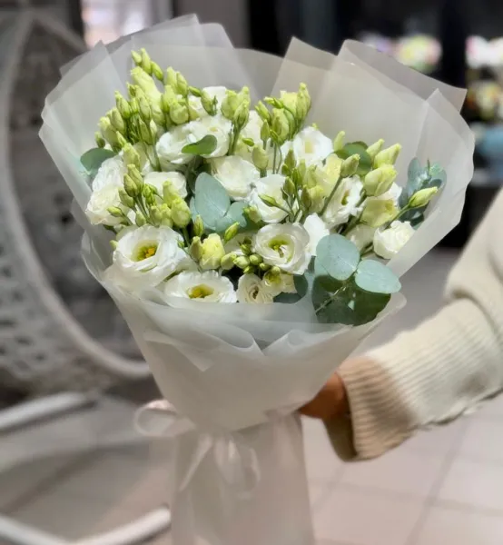 Перед вами – легкое прикосновение утренней росы, воплощенное в изысканной композиции. Нежные, трепетные бутоны белой эустомы, похожие на полураскрытые колокольчики, словно шепчут о зарождении новых чувств, о чистоте и безмятежности. Их бархатистые, хрупкие лепестки, оттенка первого снега, обладают утонченной грацией, которая завораживает своей деликатностью. Каждая веточка эустомы – это символ нежности, признательности и восхищения, пробуждающий ассоциации с весенним пробуждением природы.