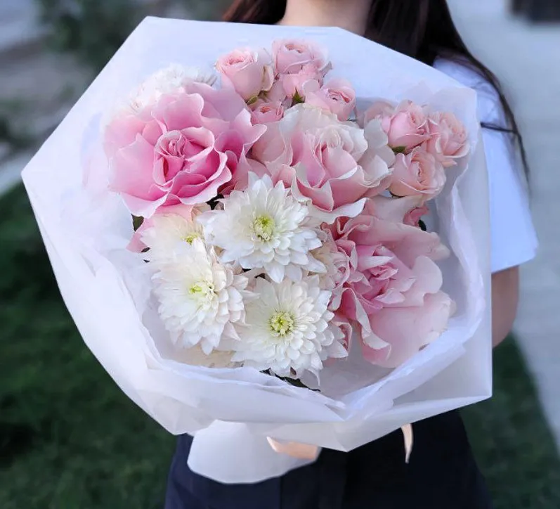 Французские розы - 3 шт., кустовые розы - 2 шт., кустовая хризантема - 1 шт., диантус - 1 шт., упаковка, лента |