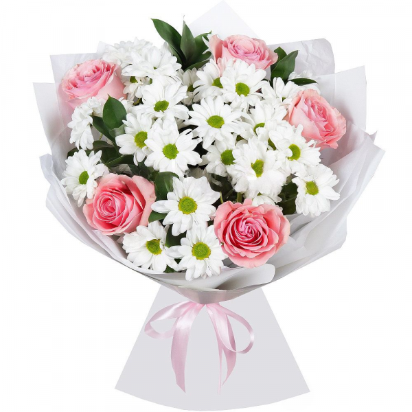 Вариант—Стандарт (Кустовая хризантема 4 шт,, роза 5шт, зелень, упаковка, лента)