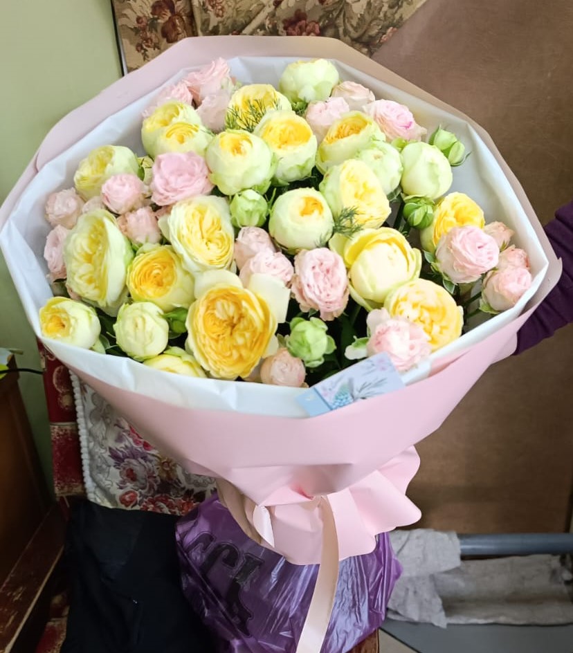 Пионовидные розы символизируют любовь, изящество и благородство чувств. Их роскошная форма и мягкие оттенки создают атмосферу праздника и радости, что делает такой букет идеальным подарком для самых трепетных моментов жизни — от романтических свиданий до торжественных событий.