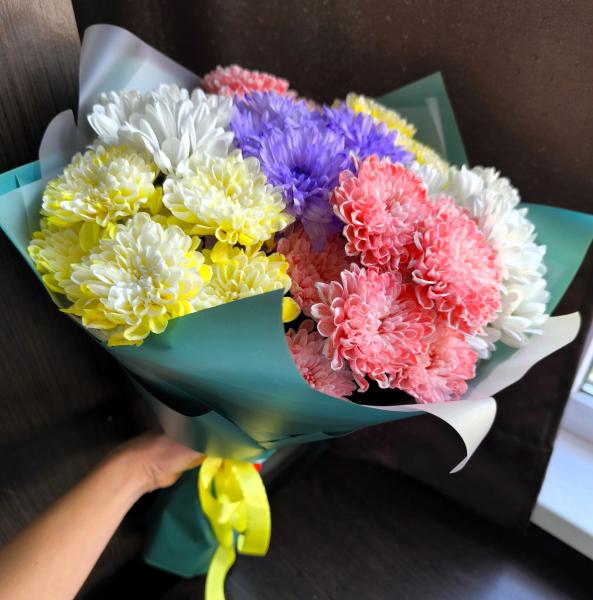 Кустовые хризантемы, собранные в компактный букет, излучают тепло и уют, напоминают о ярких осенних днях. Они оформлены в элегантную композицию, где цветы нежно переплетаются друг с другом, создавая ощущение легкости и воздушности. Благодаря разнообразию оттенков, букет удивительным образом способен подчеркивать индивидуальность каждого момента — будь то семейный праздник, романтический ужин или просто желание порадовать близкого человека.